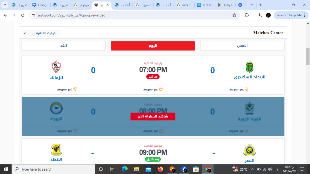مباريات اليوم المتاحة على موقع اوت سبورت AWTSPORT